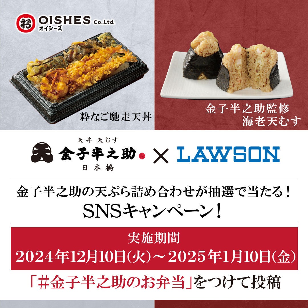 オイシーズ株式会社(本社:東京都 千代田区、代表取締役社長:工藤 智)傘下の株式会社and RICEは、株式会社ローソンの「名店監修フェア」において、2024年12月10日(火)から「まちかど厨房」を展開している全国のローソン店舗(約9,400店舗)で販売する「金子半之助監修 粋なご馳走天丼」と、全国のローソン店舗(約13,400店舗、「ローソンストア100」を除く)で販売する「金子半之助監修 海老天むす」を監修いたしました。