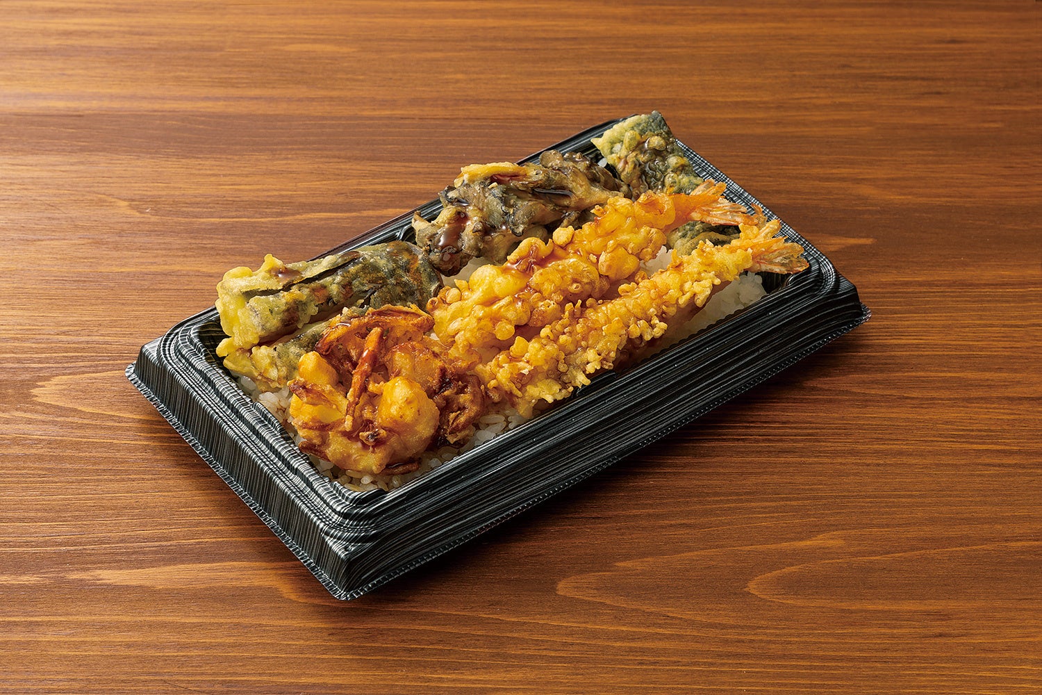 店舗で炊き上げたごはんに、店舗で揚げた海老天2本、烏賊のかき揚げ、舞茸天、茄子天、海苔天をあわせた天丼弁当。